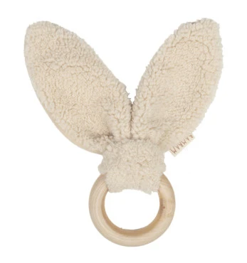 Bijten en knuffelen tegelijk! Deze bijtring van BamBam, gemaakt van FSC hout, heeft zachte oortjes van gerecycled materiaal. De bijtring is 23 cm lang.