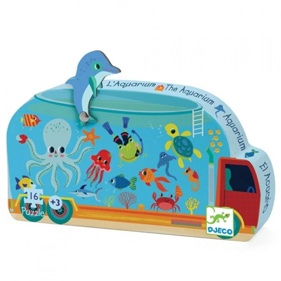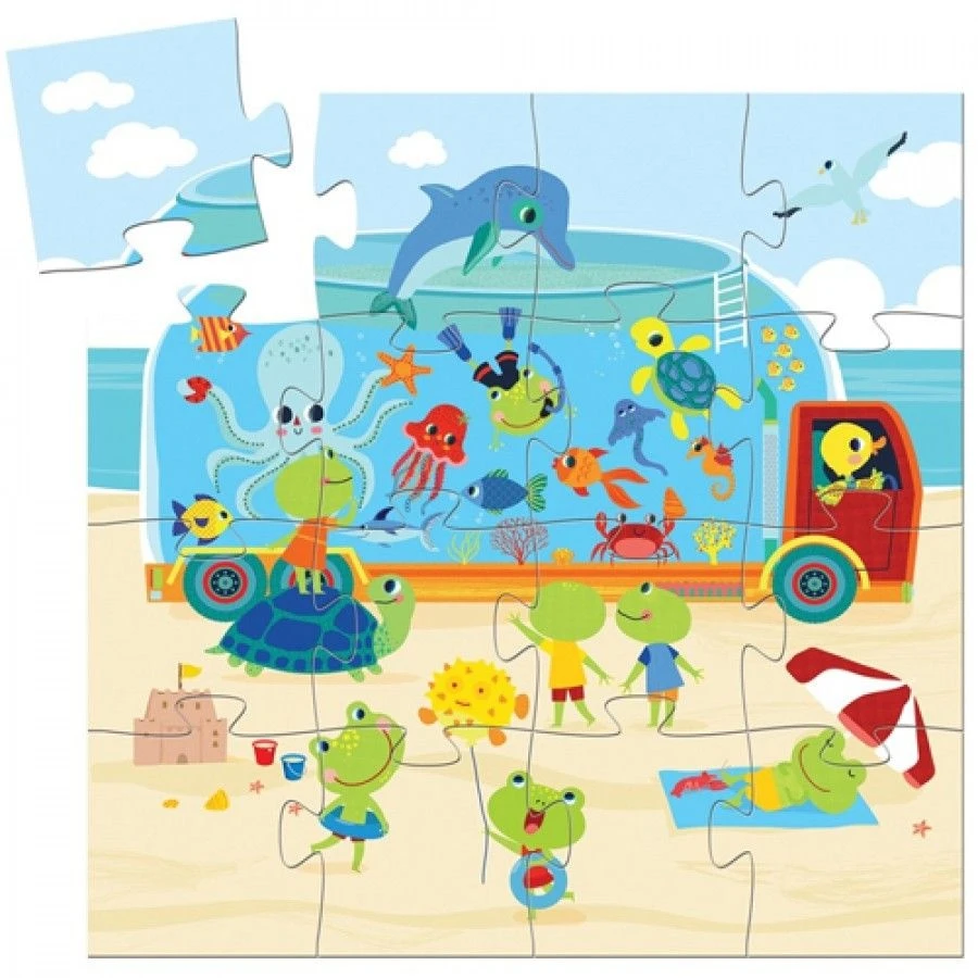 Op deze kartonnen puzzel van Djeco zie je een vrachtwagen een aquarium vervoeren. De vrachtwagen staat op het strand en een kikkerfamilie kijkt wat er allemaal in de vrachtauto zit. De puzzel bestaat uit 16 stukjes en is geschikt voor kinderen vanaf 3 jaa