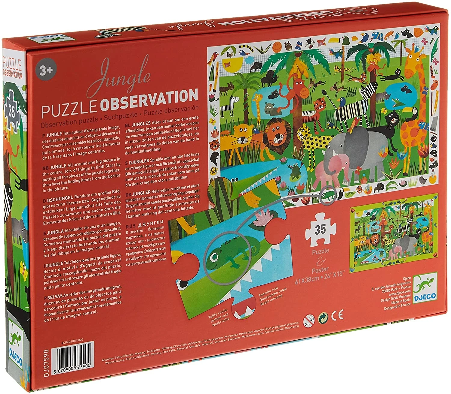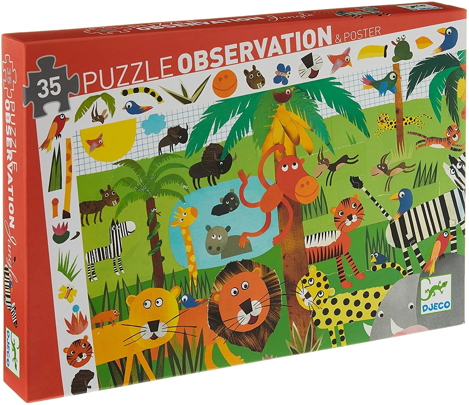 Op deze observatie puzzel: de jungle van Djeco zie je heel veel dieren uit de jungle, zoals een leeuw, tijger, zebra, giraffe en nog veel meer dieren. Leg de 35 stukken in elkaar en je weet het. Geschikt voor kinderen vanaf 3 jaar.