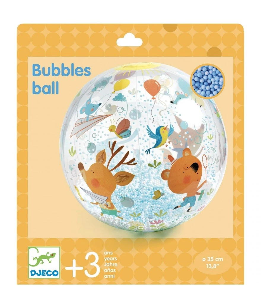 Deze opblaasbare bal van Djeco is licht en gemakkelijk overal mee naar toe te nemen. In de bal zitten allemaal korreltjes die voor een leuk effect zorgen als je met de bal gaat gooien. Doorsnede: 35 cm.