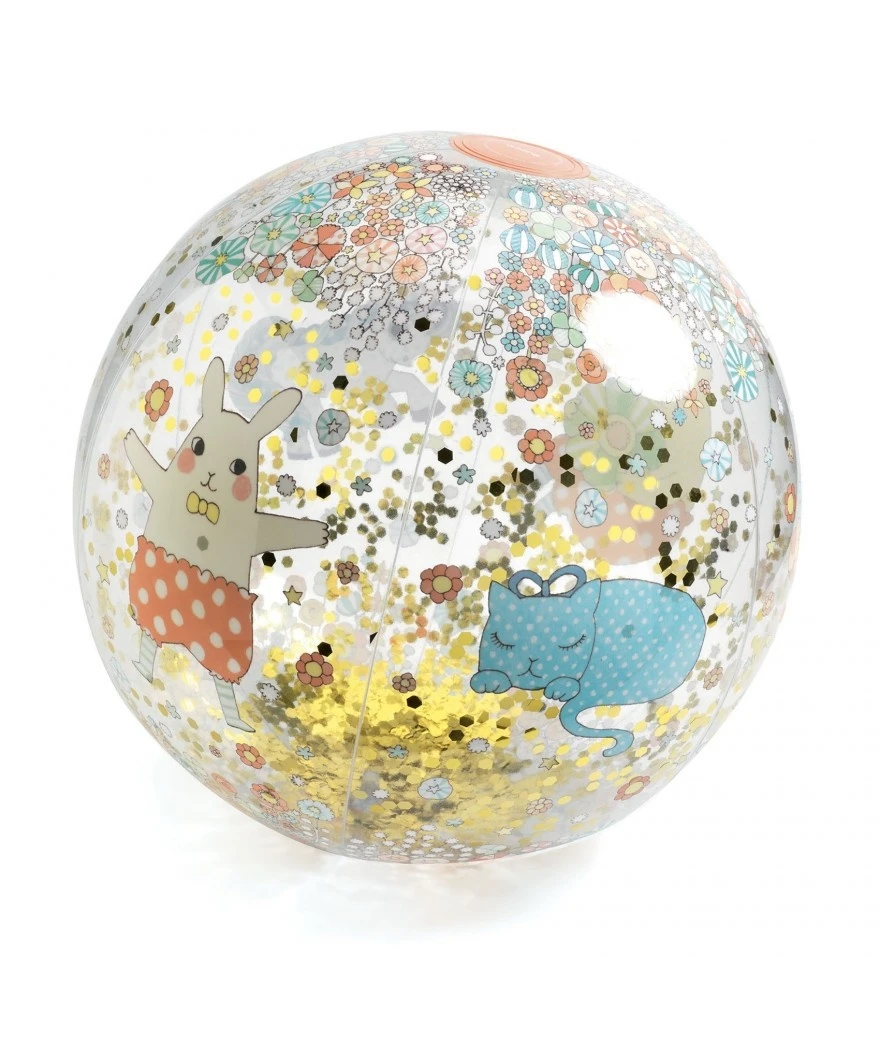Deze Kawaii opblaasbare bal van Djeco is licht en gemakkelijk overal mee naar toe te nemen. Eenmaal opgepompt zie je allemaal lovertjes in de bal dwarrelen. Doorsnede: 35 cm.