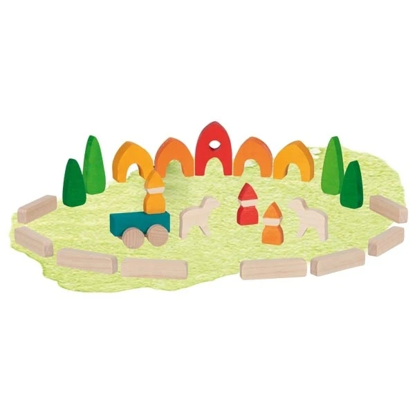 De 25 houten bouwstenen vormen een klein geheel dorp en toch laten ze ruimte over voor dat van het kind verbeelding. De felle kleuren verbergen het hout niet, maar laat de structuur zien. Geschikt voor kinderen vanaf 3 jaar. Made in Europe.