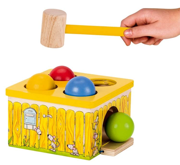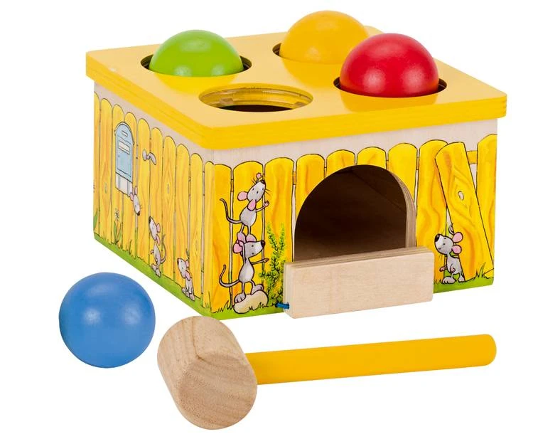 Een leuk houten hamerspel vang de muis van Goki, in vrolijke kleuren beschilderd. Sla met de hamer op de kogel in het muizenhuis en probeer hem snel te vangen. De ballen blijven in het huis als je het plankje omhoog doet.
