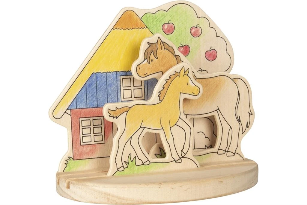 Een set van Goki bestaande uit drie afbeeldingen die met een manege te maken hebben, je kunt ze zelf inkleuren of verven. De houten afbeeldingen kunnen als ze gekleurd zijn in de standaard worden gestoken. Zo krijg je een 3D effect.