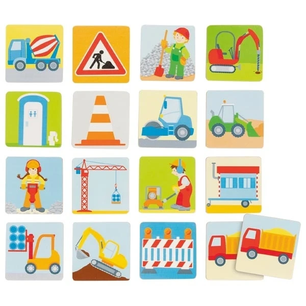 Een houten memospel van Goki met afbeeldingen van diverse voertuigen en mensen die je op een bouwplaats kunt tegenkomen. Goed voor het korte termijn geheugen.