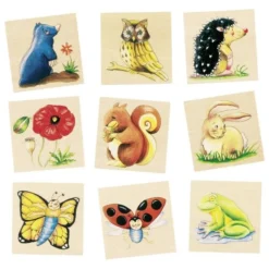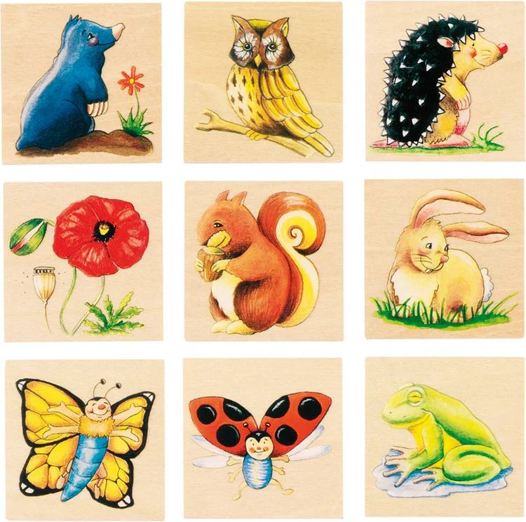 Een houten memospel van Goki met afbeeldingen van dieren die in de tuin voorkomen. Goed voor het korte termijn geheugen.