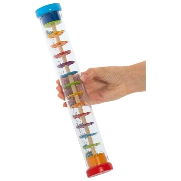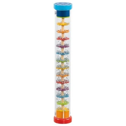 Deze regenmaker van Goki is maar liefst 34 cm hoog en 5 cm dik. Een kleine beweging met de regenmaker die gemaakt is van kunststof doet de metalen kogeltjes al rammelen.