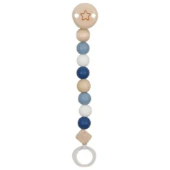 Speenkettingen worden aan de kleding van de baby vastgemaakt, zodat de fopspeen niet kwijtraakt en de baby vrolijk blijft. Deze speenketting is gemaakt in Duitsland.