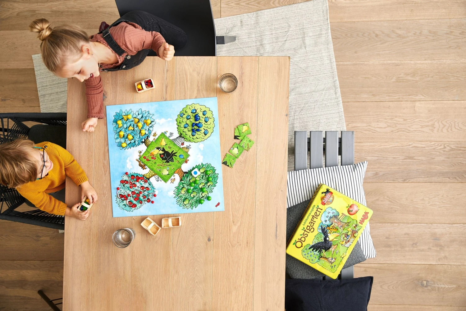 In de boomgaard hangen de sappigste kersen, appels, pruimen en peren. Maar iemand wil ze stelen: raaf Theo is in aantocht! Nu hebben de spelers wat geluk met de dobbelstenen nodig. Samen proberen ze het fruit te oogsten voordat de gulzige raaf de boomgaar
