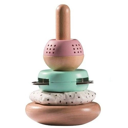 Deze stapeltoren van Hape is naast een stapelfiguur ook een rammelaar. De nieuwsgierige kleintjes kunnen op deze manier hun zintuigen stimuleren. Het bovenste vormpje is een rammelaar, dan volgt een kleine tamboerijn en onderaan is een zacht knisperend ku