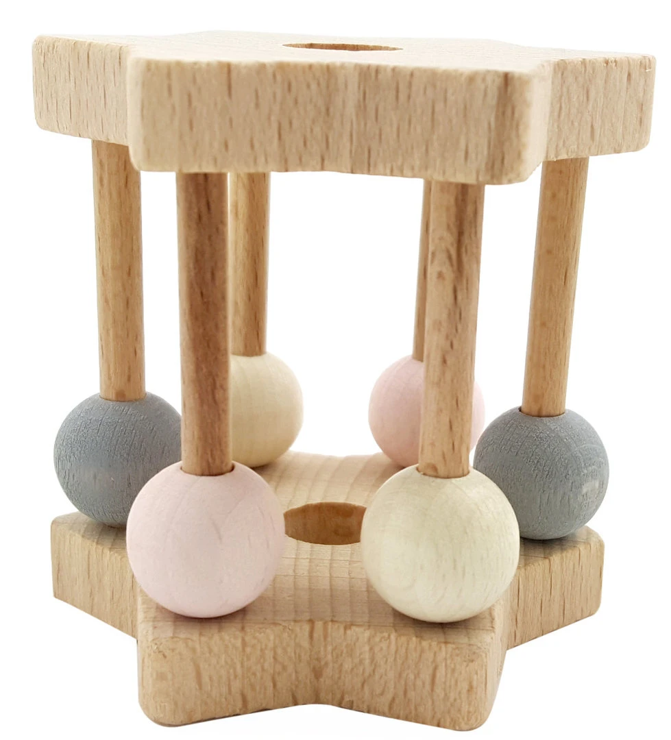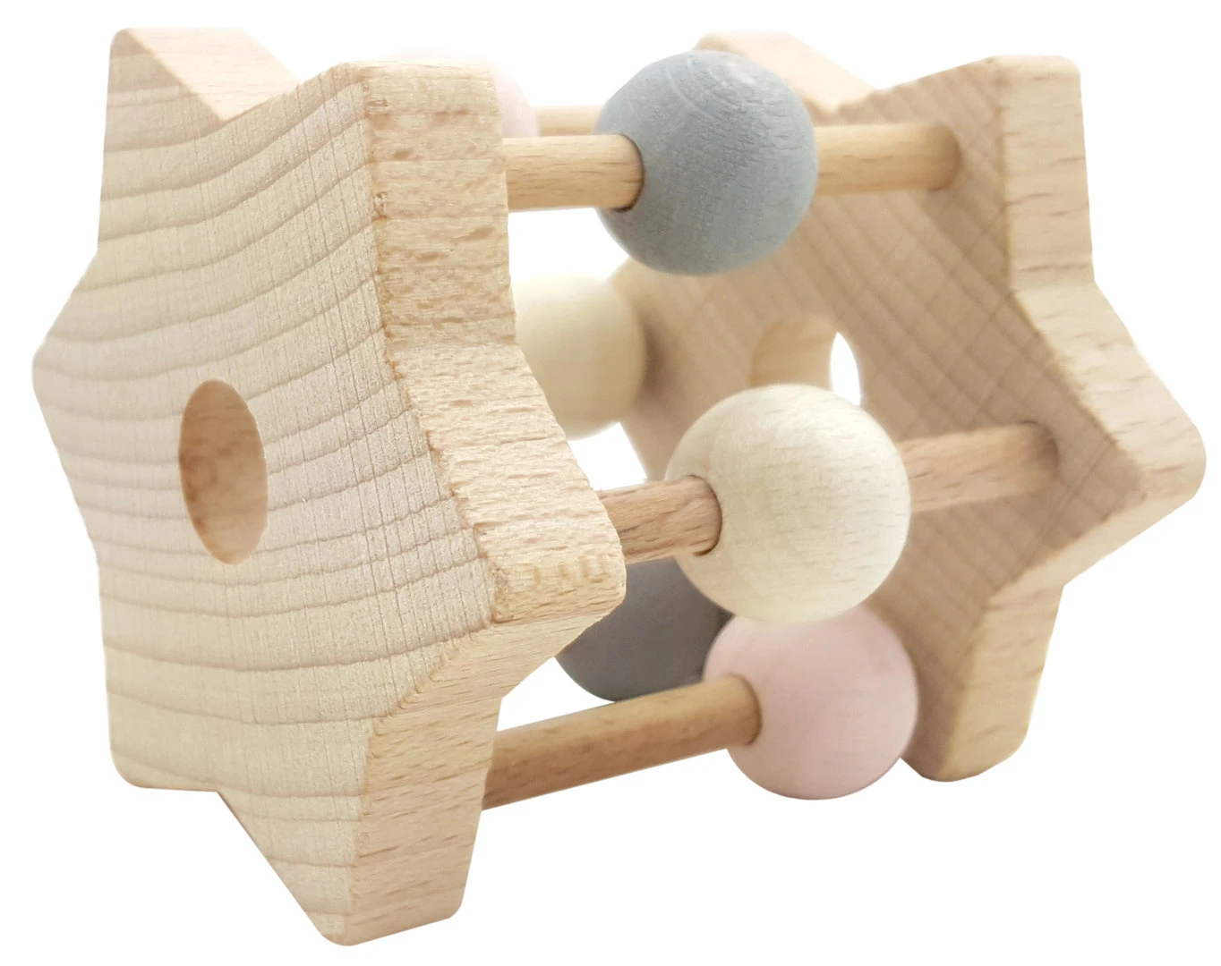 Dit grijpfiguur van Hess is hoogwaardig afgewerkt. Deze rammelaar in de vorm van een tweetal sterren met daartussen houten staafjes met roze, grijs gekleurde balletjes, daar kunnen ze lekker mee rammelen. Door de vorm gemakkelijk vast te pakken, ook voor