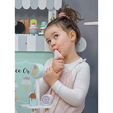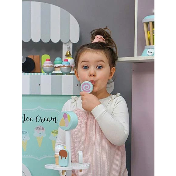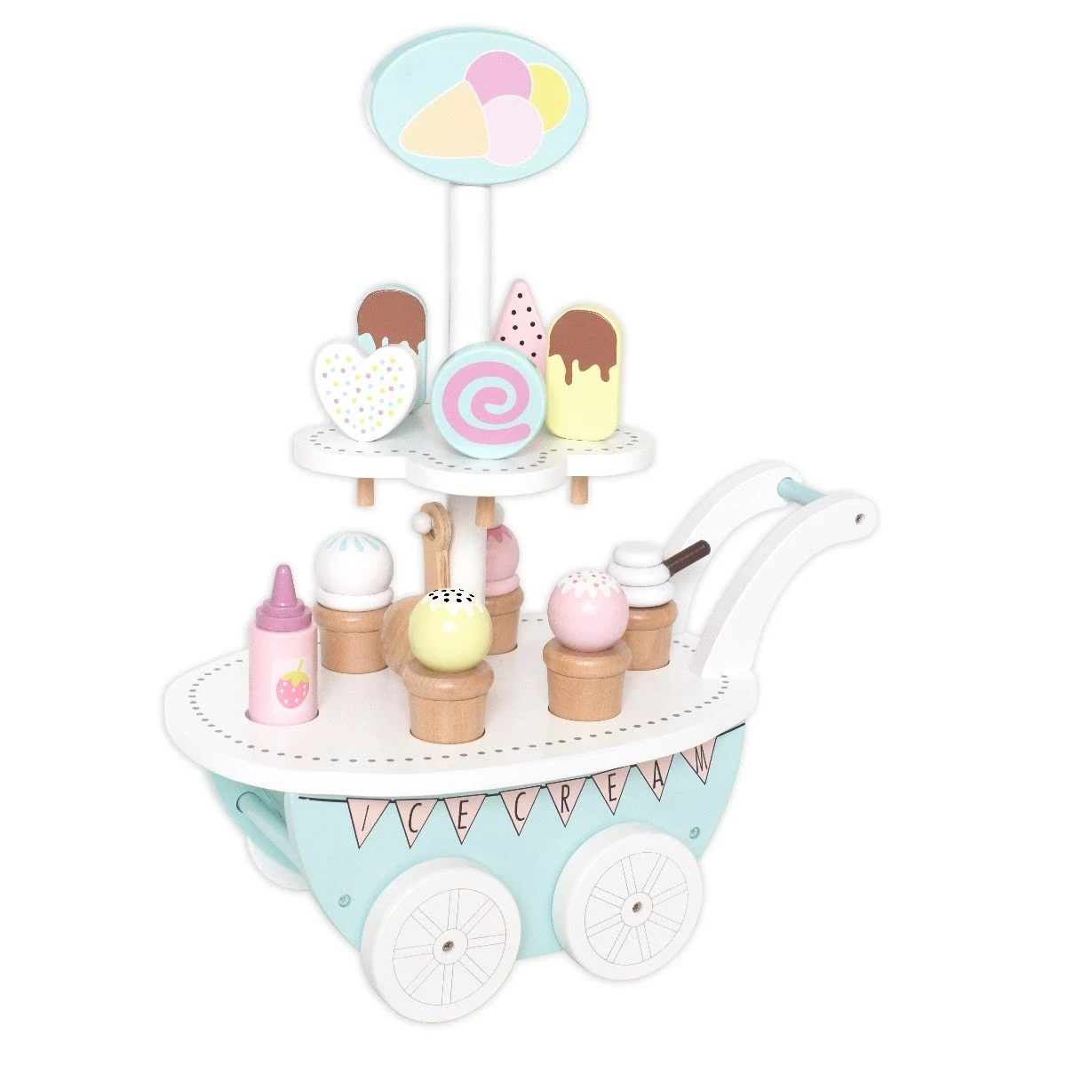 Deze houten ijscokar van JaBaDaBaDo is uitgevoerd in mooie pastelkleuren. De ijskar bestaat uit 10 ijsjes, een potje aardbeiensaus en een ijslepel. De ijstrolley is compact gemaakt zodat hij gemakkelijk weggezet kan worden.