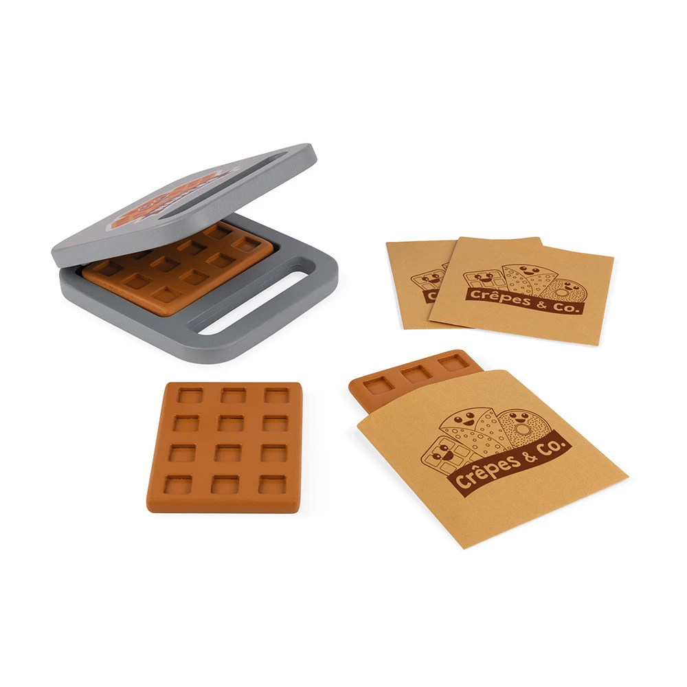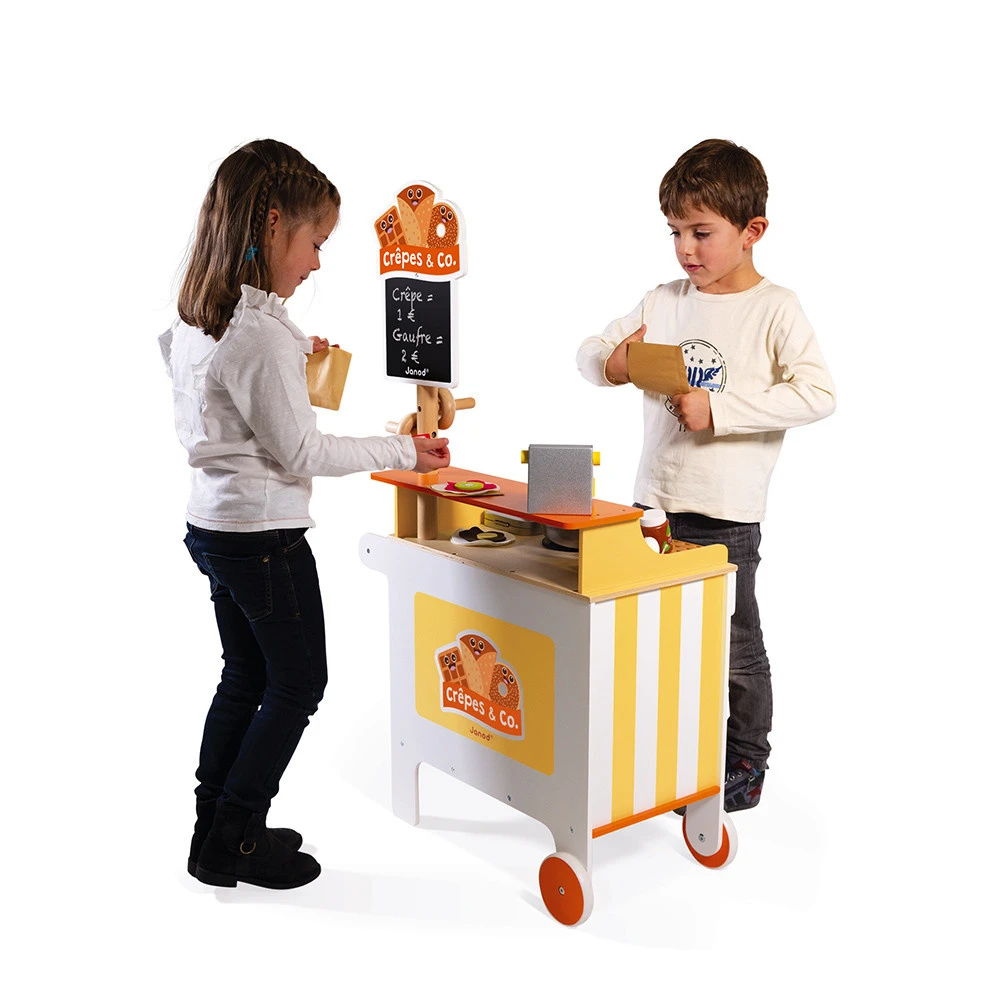 Om goede crêpes te maken heb je nodig : een gemakkelijk verplaatsbare mobiele standaard ‘Crêpes & Co’ met 40 accessoires : 1 kassa, 1 set munten en biljetten, 1 wafelijzer, 3 wafels, 3 donuts, 1 doos van 4 eieren, 1 pot spread, 3 crêpes,