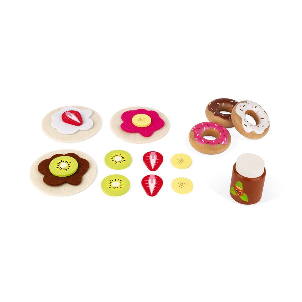 3 ‘vullingen’ voor de crêpes, 1 kom, 1 garde, 1 crêpe hark, 9 stukjes gesneden fruit, 1 tang, 3 kraft papieren zakken, 2 kartonnen dozen voedsel en 1 doos krijtjes. Door zichzelf in de schoenen te schuiven van kleine handelaars die donuts en wafels verkopen, zullen de kinderen verbeeldingskracht ontwikkelen en hun bewegingen verfijnen om onafhankelijk te worden. Op de kleine lei op de voorkant staan de openingstijden en specials van de dag. Hoogte werkblad : 50,5 cm.