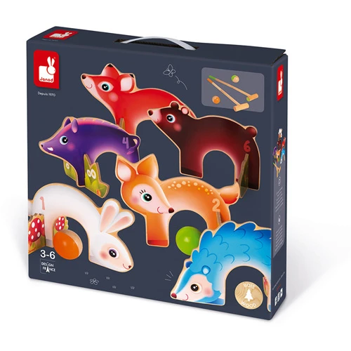 Dit croquet spel van Janod bestaat uit 6 poortjes die de vorm van een bosdier hebben, 2 ballen en 2 houten stokken. Niet alleen een leuk spel maar ook een eenvoudig behendigheidsspel om samen met de hele familie of met vriendjes en vriendinnetjes te spele