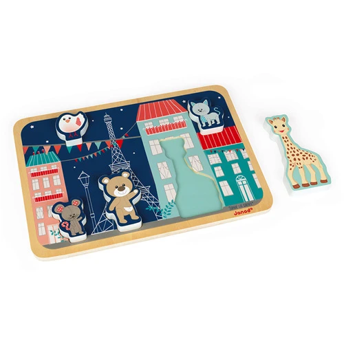 Houten chunky puzzel met daarop de figuren van Sophie la Girafe en haar vrienden in een mooi Parijs decor. Met de figuren van deze houten puzzel van Janod kan ook gespeeld worden want ze blijven rechtop staan. Geschikt voor kinderen 18=36 maanden.