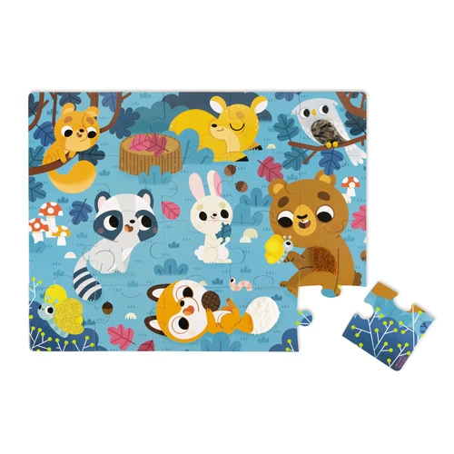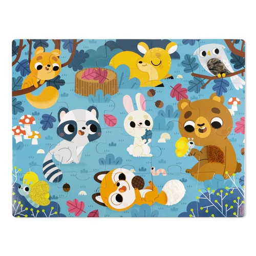 Met deze kartonnen reuzenpuzzel van Janod, kun je de dieren ook voelen die op de puzzel staan afgebeeld. De “vacht” van de dieren is namelijk aan te raken en te voelen. Een voorbeeld poster wordt meegeleverd. De puzzel heeft 20 stukjes en is geschikt voor