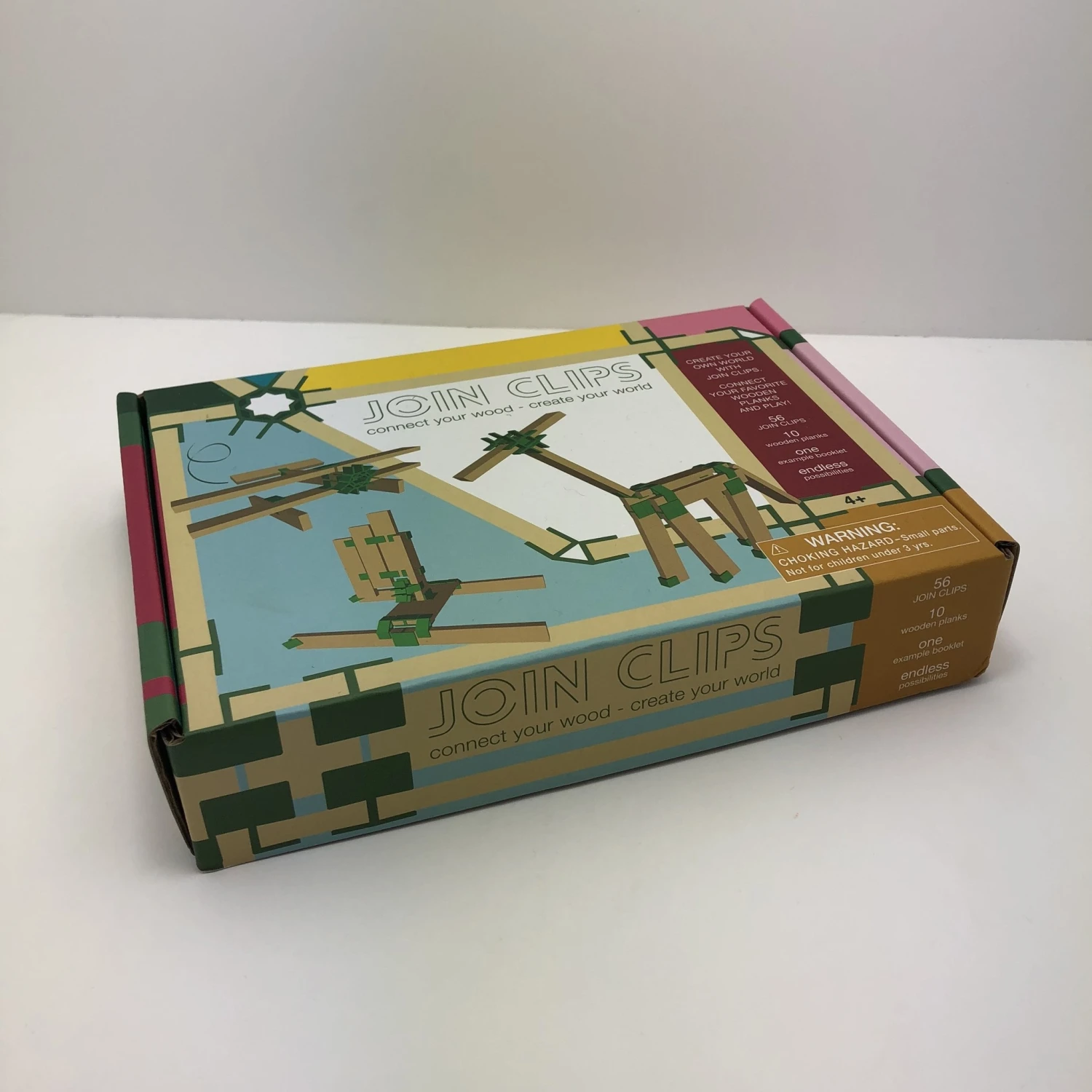 Dit is de mini set van JOIN CLIPS. Met deze basisset die bestaat uit slim gevormde verbindingselementen en houten plankjes kun je van alles maken; zoals vliegtuigen, dieren, figuren of boten.
