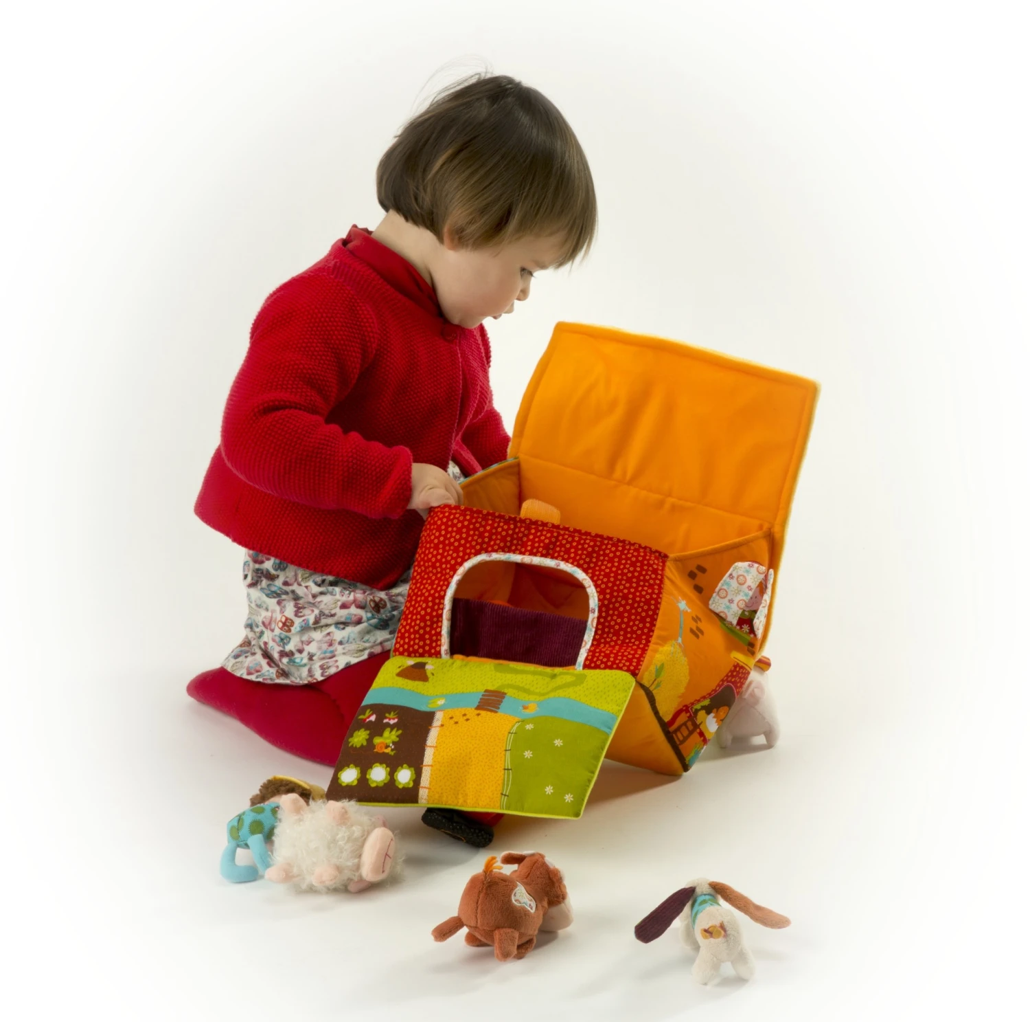 De boerderij Lilliputiens is een huisje dat je overal mee naartoe kunt nemen dankzij het handvat. Er woont een kleine boer en al je vrienden van het platteland: Jef de hond, Vicky de koe, Ophélie de kip, Nicky de eend, een schaapje en een varkentje. Open