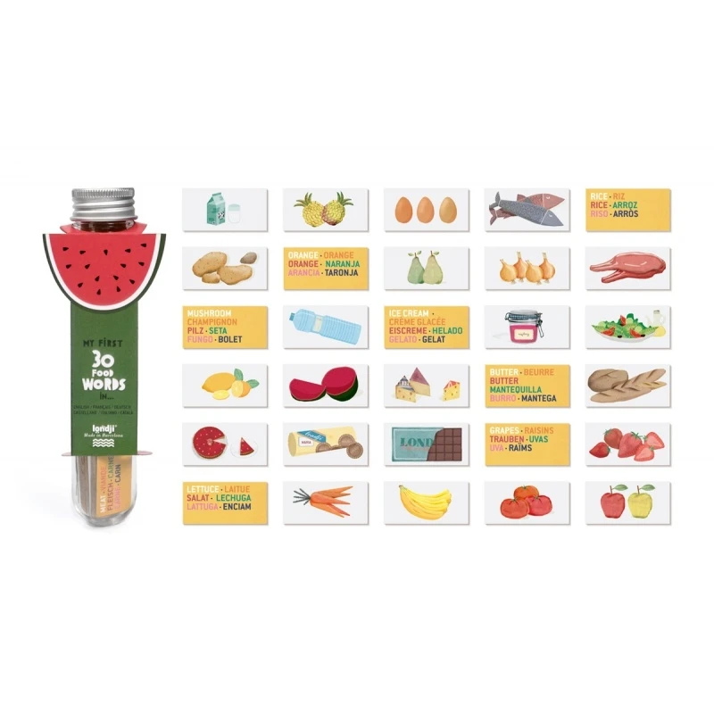 Handig leerzaam spel voor onderweg, woorden leren die met voedsel te maken hebben. 28 kaartjes van stevig karton waarop in 6 talen het voedsel staat. (Engels/Duits/Spaans/Catalaans/Frans/Italiaans)