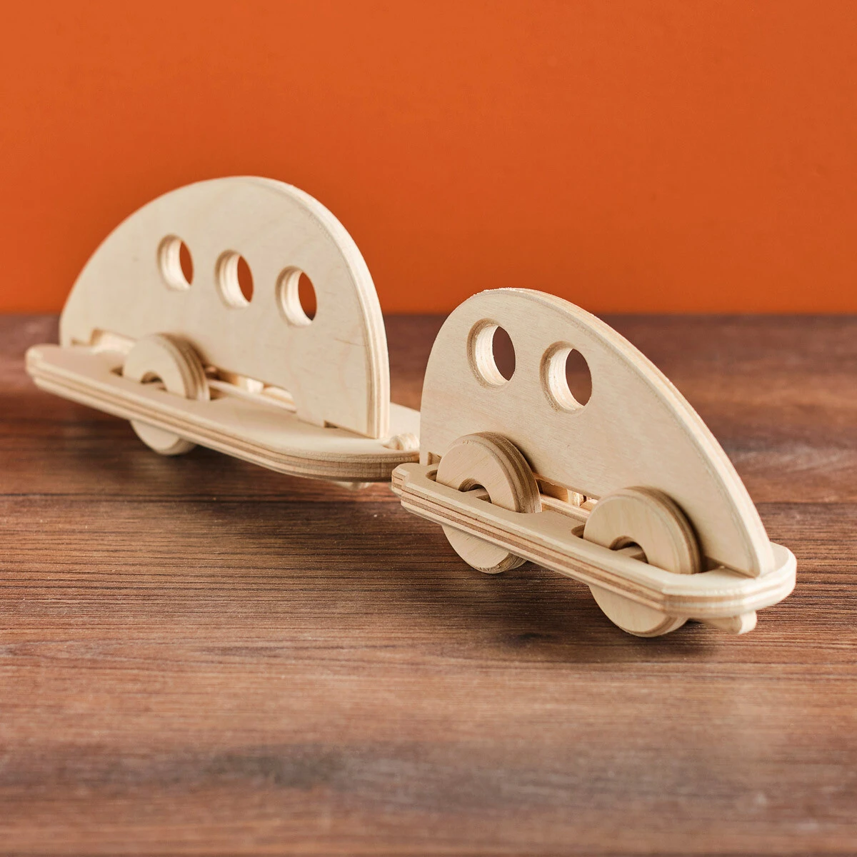 De set is helemaal gemaakt van multiplex en is eenvoudig in elkaar te zetten. Voor kinderen is het lastig om ze uit elkaar te halen, dus weinig kans op wielen die zoek raken.