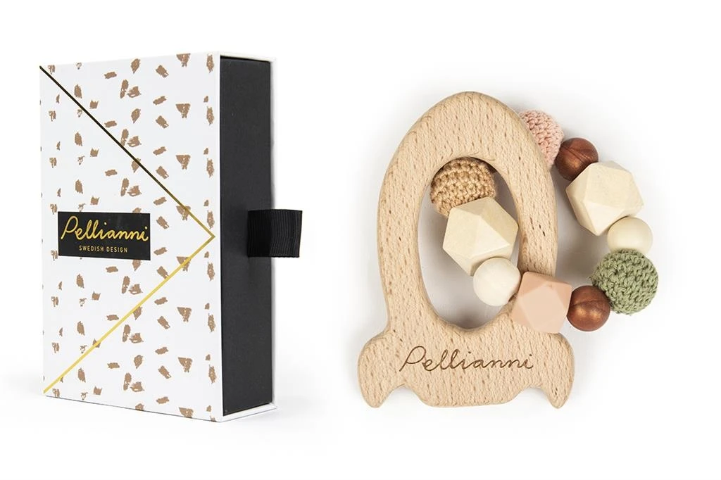 Deze bijtring of rammelaar van Pellianni is uitgevoerd in herfstkleuren. De bijtring is van organisch, onbehandeld FSC hout (beuken/esdoorn) en katoenen garen. De bijtring wordt in een mooie geschenkdoos geleverd.
