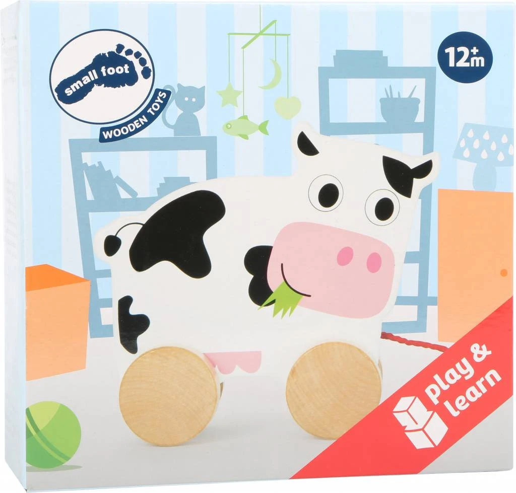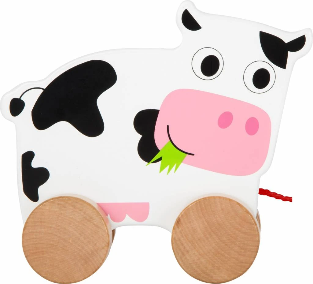 Een vrolijk kijkende koe die gras aan het eten is. Door het lange koord kunnen ze hem overal mee naar toe nemen. Voorzien van een 4-tal grote wielen zodat je overal met dit trekfiguur kunt spelen.