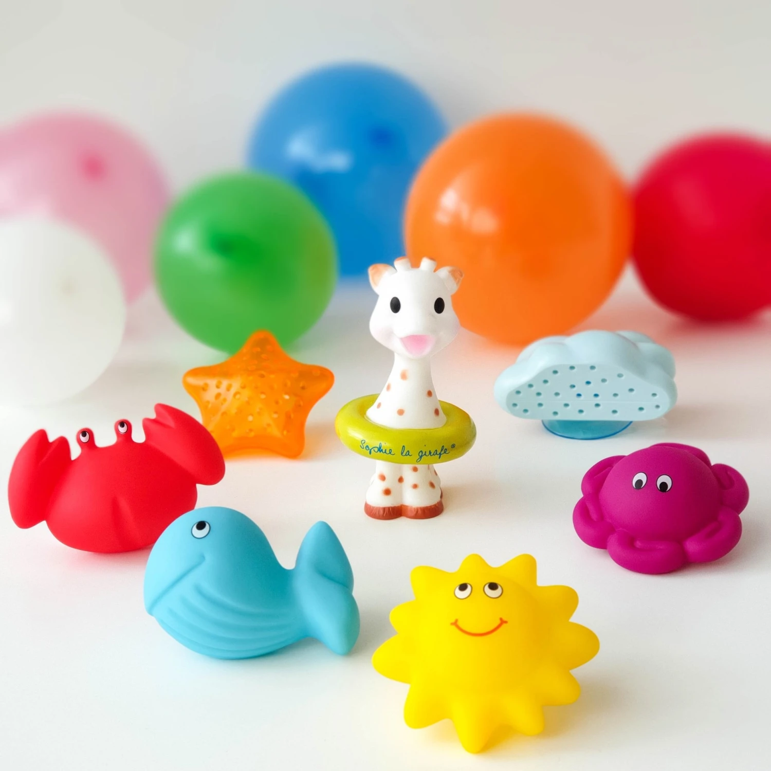 In bad gaan wordt nog leuker met deze badspeeltjes van Sophie de Giraf. Je baby ontdekt het leven in de zee dankzij deze oceaanvriendjes die je ook in de badkuip kunt plakken.
