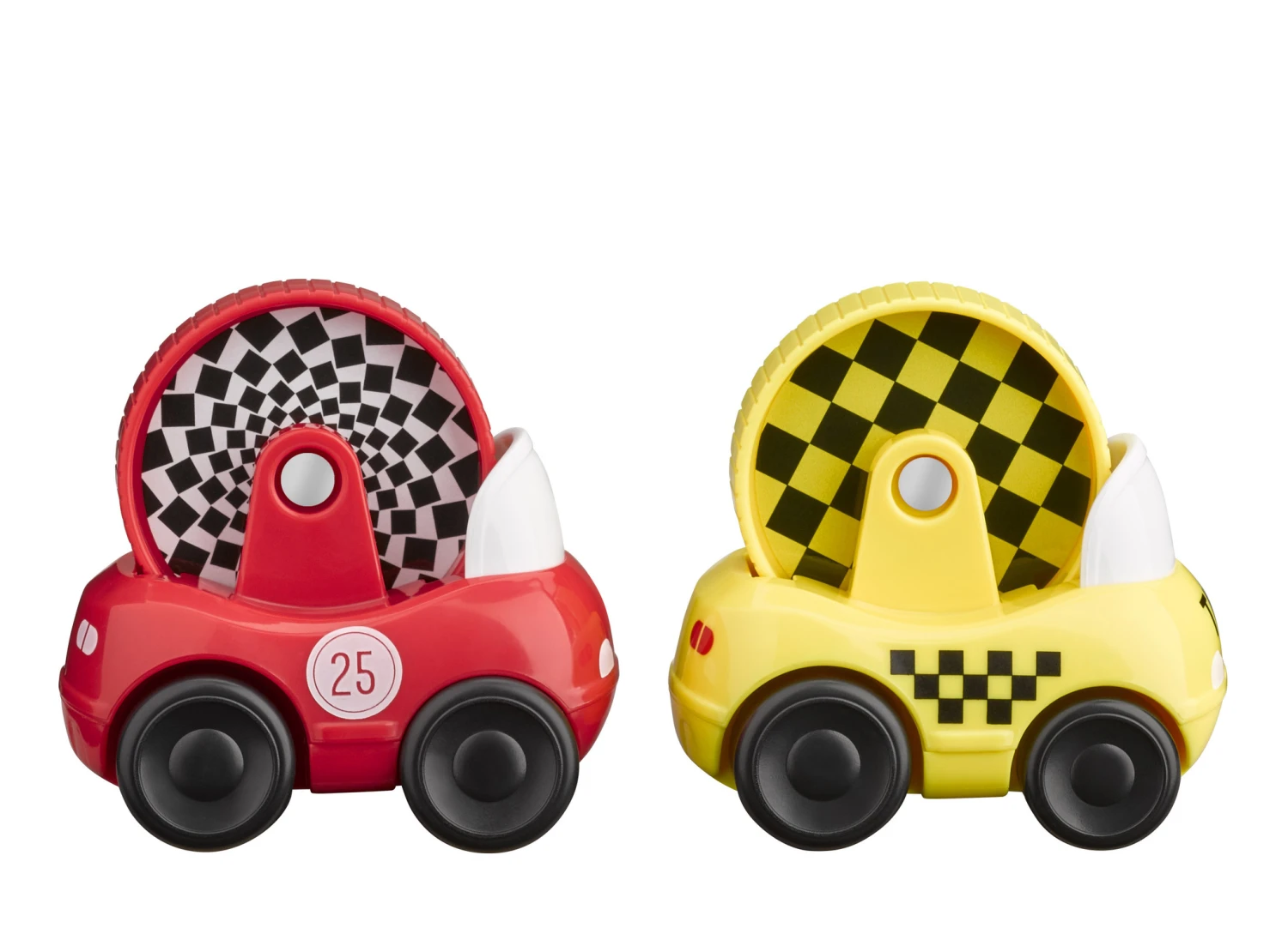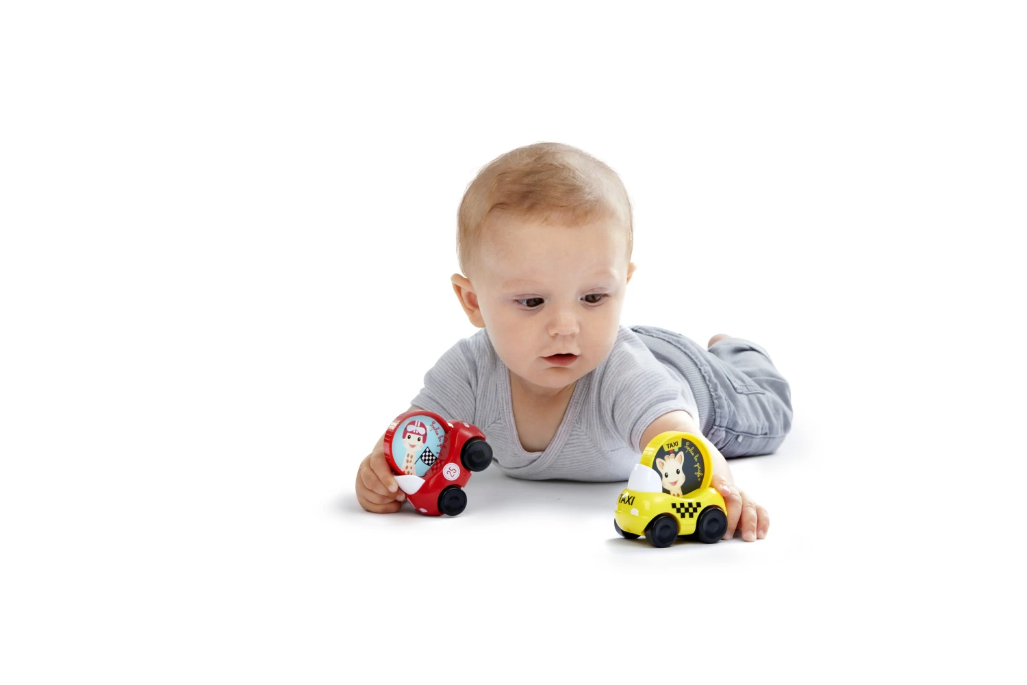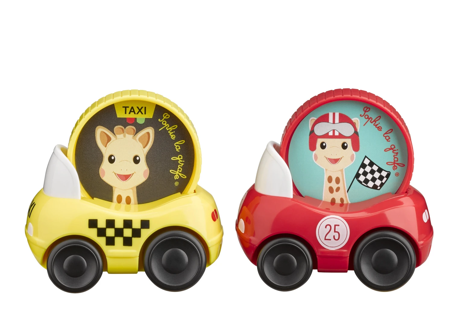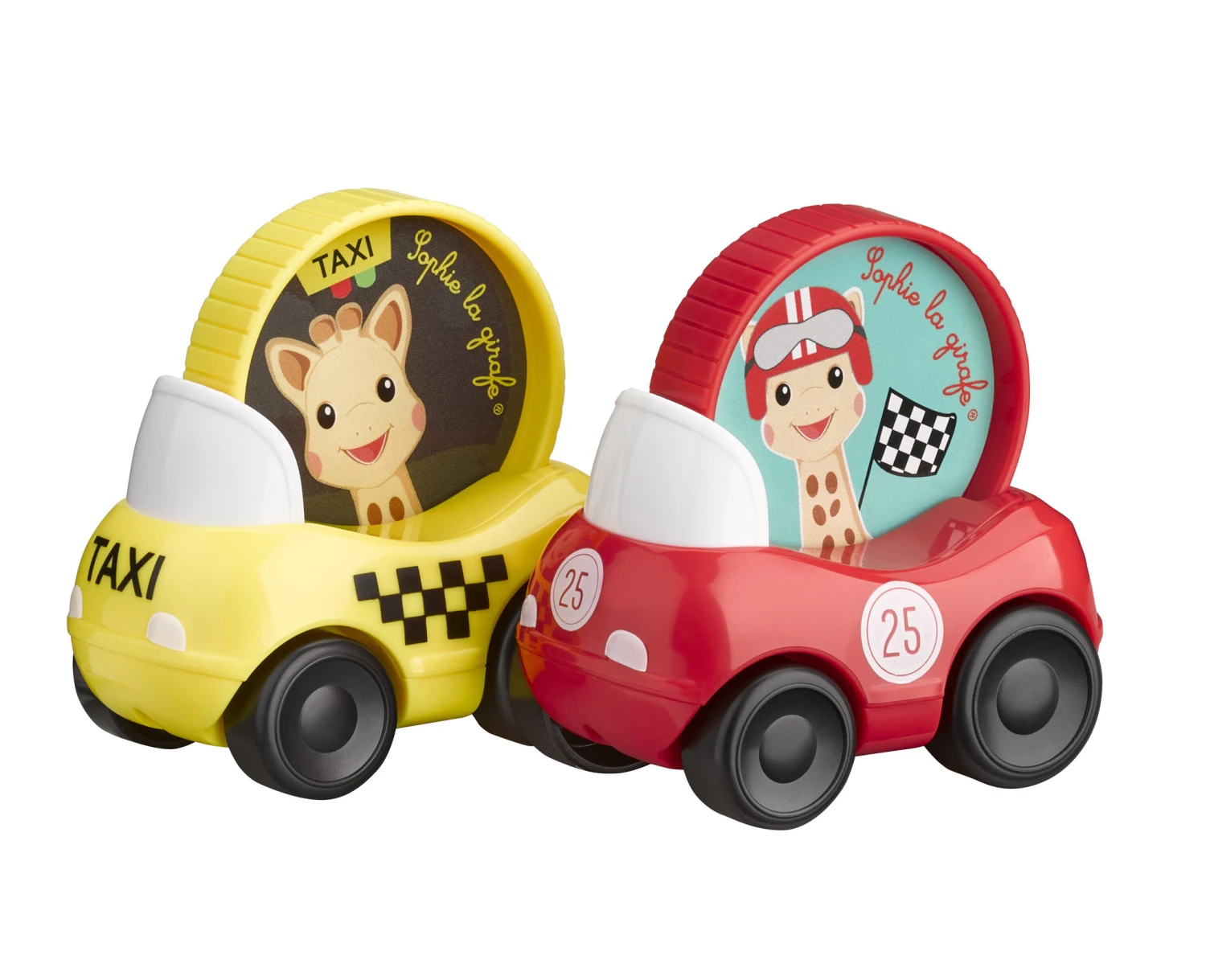 Deze set van 2 Sophie de Giraf autootjes bestaat uit een rode race auto en een gele New York taxi. Wanneer de auto rijdt dan draait Sophie rond. Gemakkelijk vast te pakken door de ronde vorm.