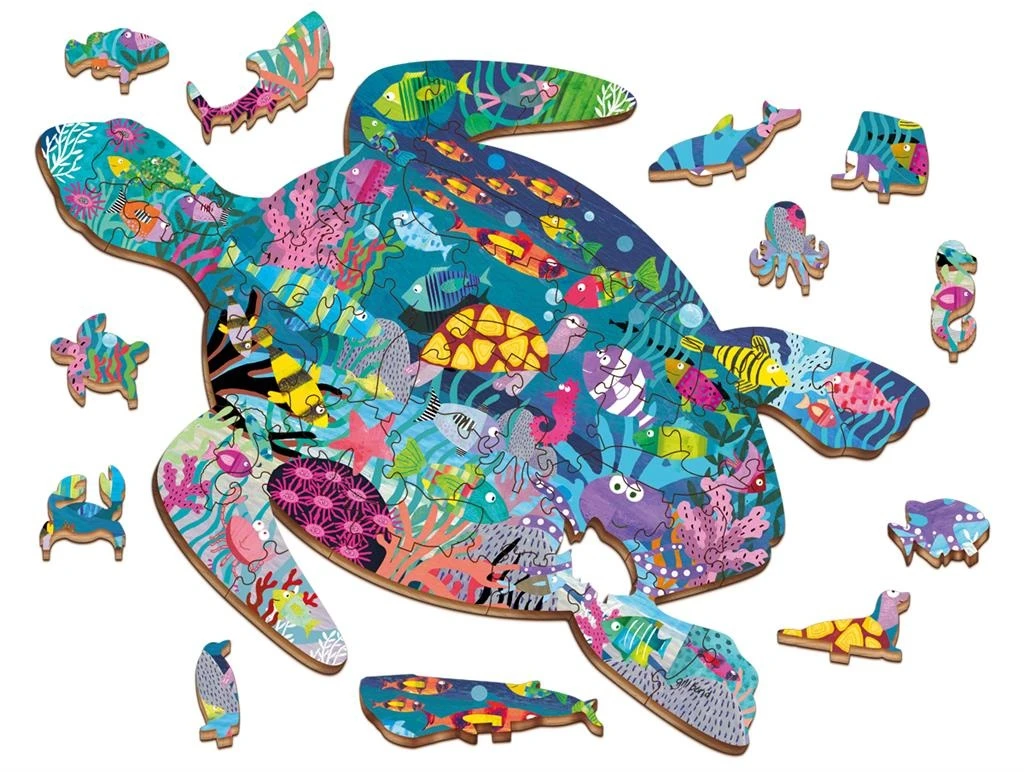 Een houten puzzel in een speciale vorm met hierop afgebeeld een kleurrijk landschap. De puzzelstukjes waaruit de puzzel is samengesteld, bestaan uit 12 voorgevormde dieren, die geplaatst kunnen worden op de daarvoor bestemde basis.